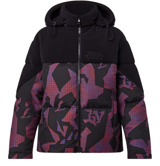 This down jacket has an enveloping oversized fit, accentuated by the LV Abstract Houndstooth motif on the main body. The graphic print, resembling urban camouflage with its abstracted signatures, is counterbalanced with black polar fleece on the upper body and the adjustable and removable hood. An embroidered Louis Vuitton signature on the chest completes this piece.