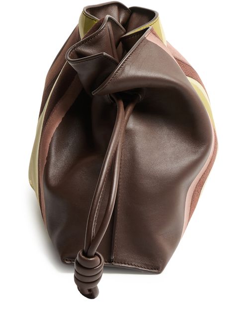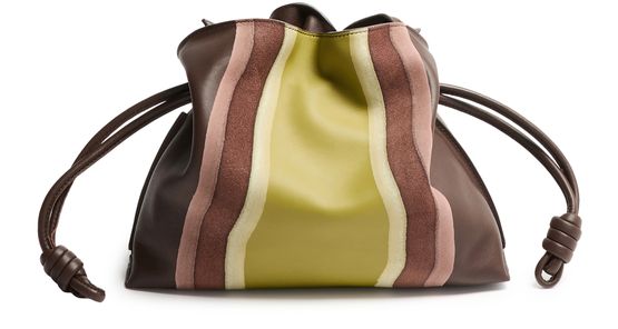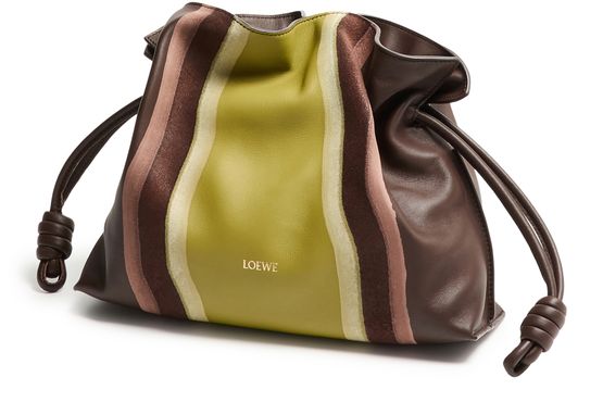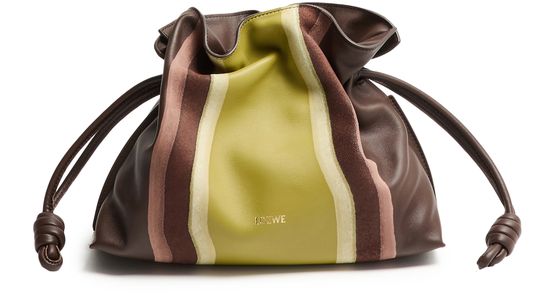 Discover Loewe's Flamenco Landscape medium clutch, where smooth leather meets a striking striped print. This exquisite piece features a single compartment and a drawstring closure, adorned with a front logo in gold letters, showcasing impeccable craftsmanship and modern elegance.