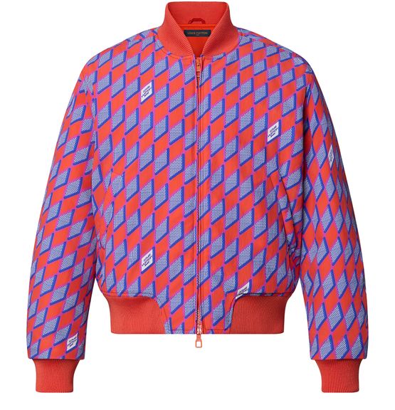 This graphic bomber features this season's Diamond Damier signature in bright saturated colors. Louis Vuitton signatures are discreetly incorporated into the motif. This lightly padded piece is made with a technical fabric and has a ribbed collar, cuffs and bottom hem.