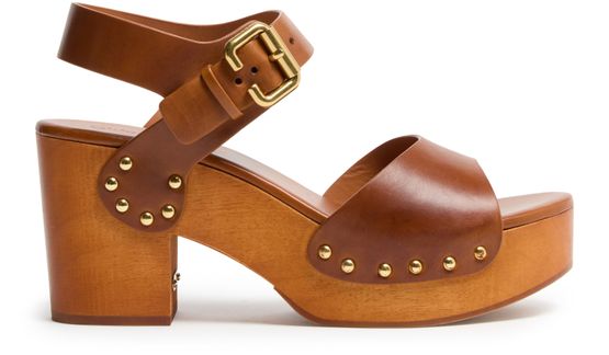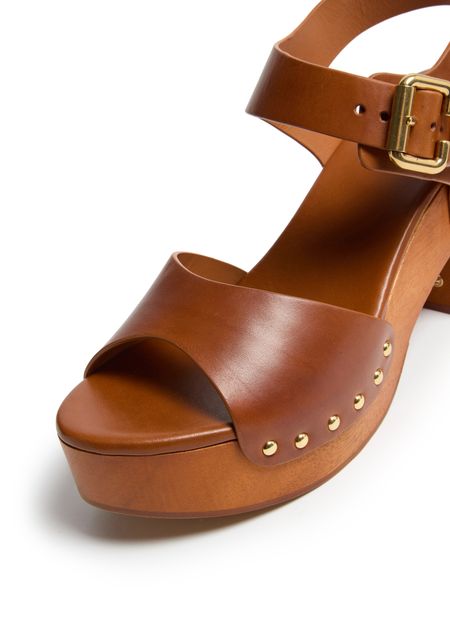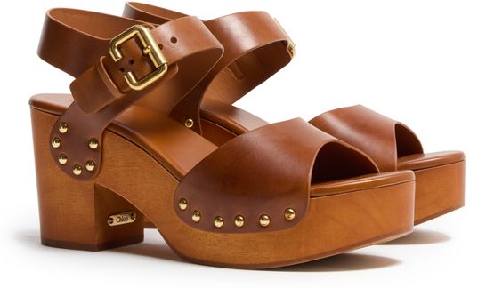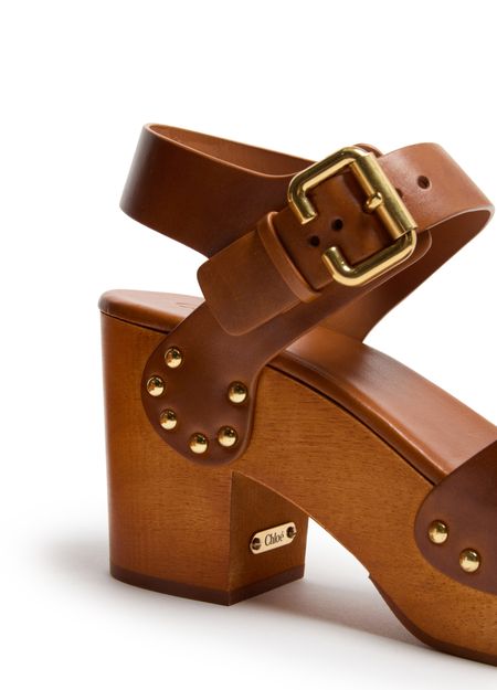 Embrace Chloe's Jeannette sandals, crafted from smooth leather with an elegantly buckled ankle strap. The medium block heel and open round toe add both style and comfort. Highlighted by gold finishes and studded details, these sandals feature a wooden sole and an engraved logo for a touch of sophistication.