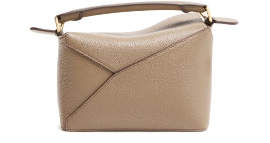 Introducing Loewe's Puzzle Edge mini bag, featuring a chic Anagram medallion. Crafted from grained leather, it boasts a single handle and a detachable strap for versatile carry. The zipper closure and visible topstitching enhance its elegant design, while the embossed logo and gold finish add a touch of sophistication.