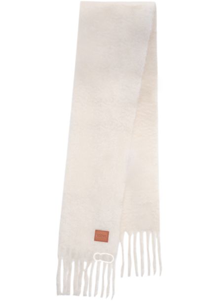 Introducing Loewe's scarf in mohair and wool, a perfect blend of warmth and style. Showcasing an embossed logo for a signature touch, this accessory is finished with fringe details that add a playful edge to your ensemble.
