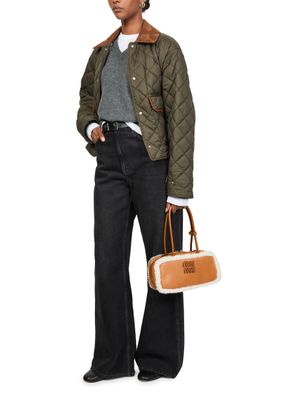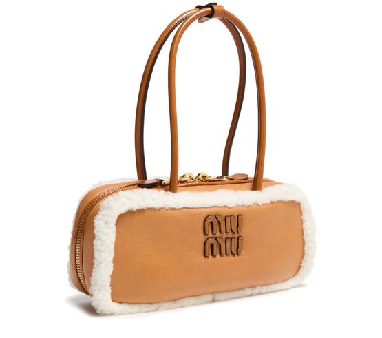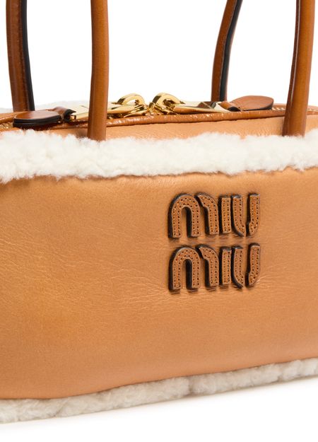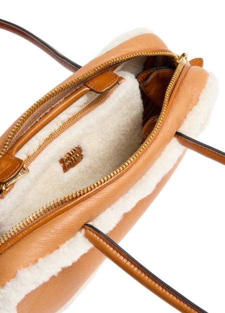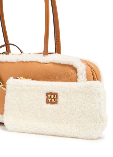 Discover Miu Miu's Beau small shearling bag, a masterpiece of elegance. Crafted from smooth leather with a metallic 'Miu Miu' lettering, this shoulder bag features double handles and a zipper closure. The detachable interior purse and visible topstitching complement its gold finish, making it a perfect addition to your modern ensemble.