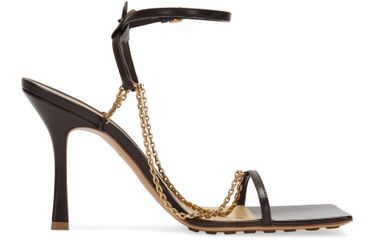 腿肚处纤巧搭扣为足部提供支撑,Bottega Veneta 此款真皮凉鞋采用方头设计,整个足部搭配有装饰链。