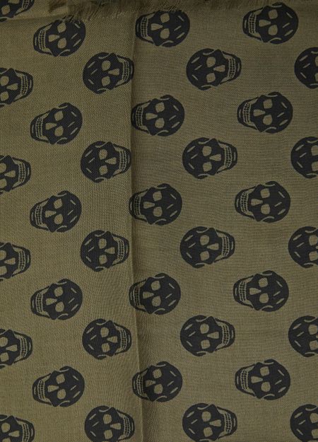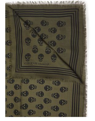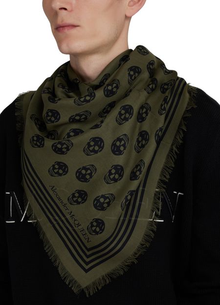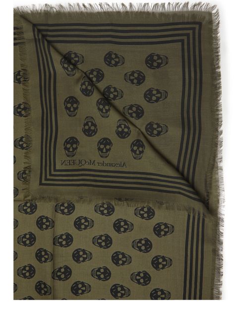 Biker 围巾选用多个 Alexander McQueen 象征标志的骷髅头装饰图案,其对比色色调与整款单品条纹图案相得益彰。