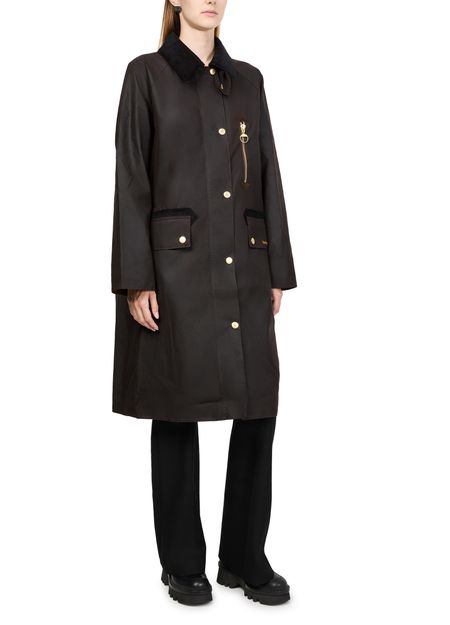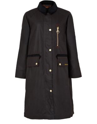 Elevate Barbour's Evette wax coat, designed in a regular fit with long sleeves. Its button fastening and flap pockets add practicality, while the embroidered logo adds a touch of sophistication. Perfect for casual outings, this jacket seamlessly combines versatility with style.