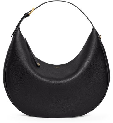 Reveal Celine's Large Celine Lulu in grained calfskin. This exquisite piece features gold finishing and offers versatile shoulder and hand carry options. A zipped closure secures the main compartment, while a metallic D-ring and adjustable strap add practical elegance.