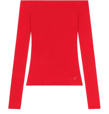 Reveal Courrèges's off shoulder rib knit top, a masterpiece in slim fit design. With its elegant bare shoulder neckline and long sleeves, this ribbed fabric top features a stylish striped print. Perfect for adding a touch of sophistication to any ensemble.