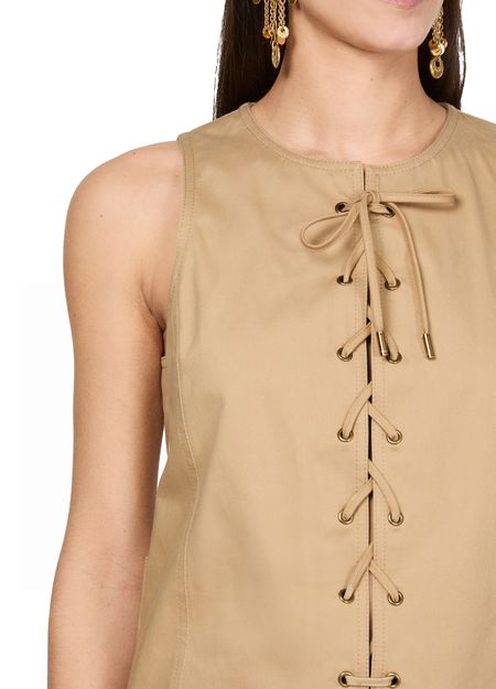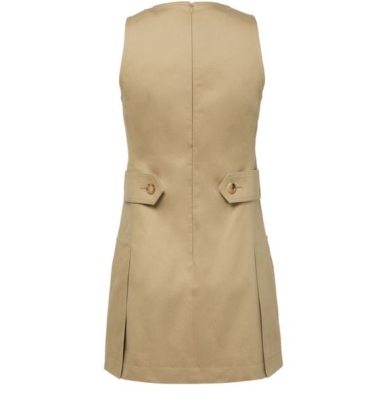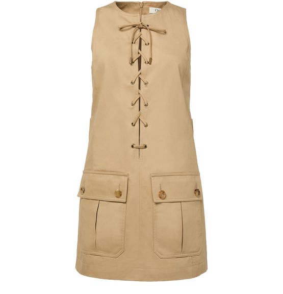 Chloé's short dress showcases an effortlessly chic style with its sleeveless design and crew neck. The A-line cut flatters every figure, while the concealed back zipper closure ensures a sleek silhouette. Large front and flap pockets add practicality, and visible stitching enhances its modern appeal, making it a perfect wardrobe staple.
