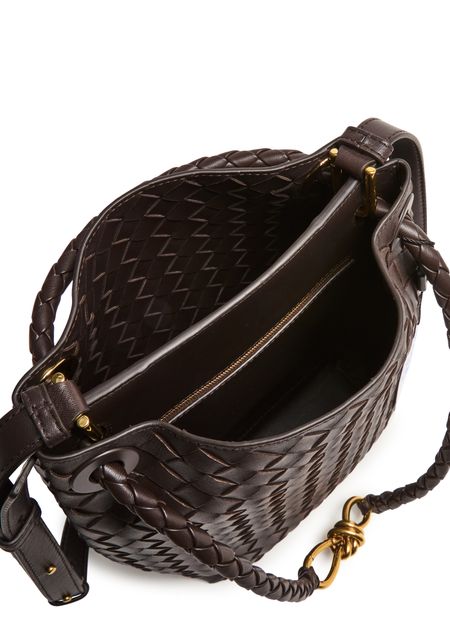 • 描述 : Small bucket bag, intrecciato weaving technique, thin strap, adjustable strap, zippered interior pocket, gold finish.