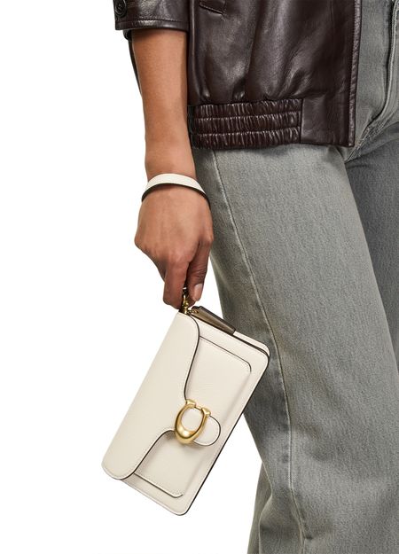 Reveal Coach's Tabby 19 shoulder bag, crafted from smooth leather with a gold finish. The magnetic "C" buckle and metallic logo on the front add signature flair, while the chain strap and visible stitching showcase modern sophistication. A decorative label with the embossed Coach logo completes this refined accessory.