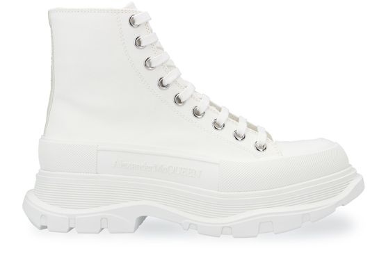 超大尺寸带槽厚鞋底,搭配细饰带装饰的 Alexander McQueen 标识,此款 Tread Slick 帆布靴和谐的对比色调将会备受女性青睐。