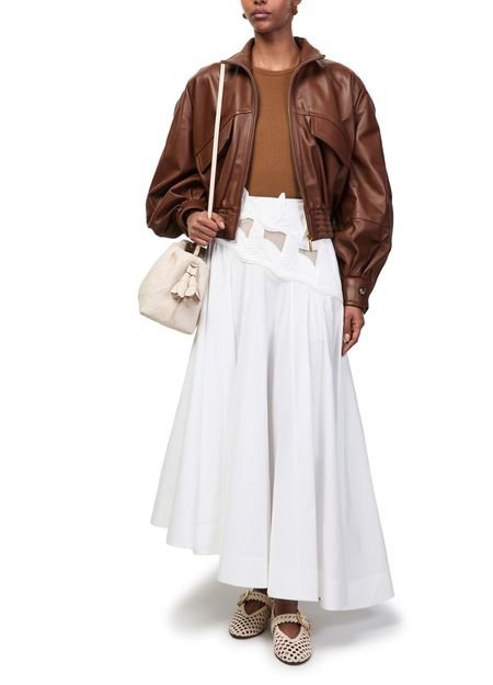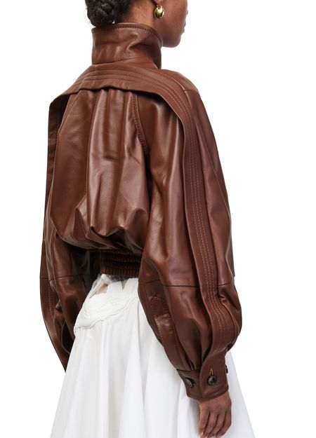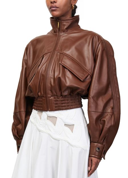 Reveal Zimmermann's Luna leather bomber jacket, crafted from smooth leather for a refined finish. The cropped silhouette, high neck, and long sleeves offer a modern edge, while flap and front pockets add practical flair. Topstitched edges complete this versatile piece, perfect for elevating any wardrobe.