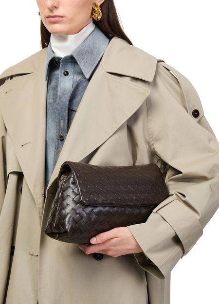 • 描述 : Shoulder bag, intrecciato weaving technique, single handle, leather handle, thin strap, front logo, geometric details, flap closure, snap-button fastening.