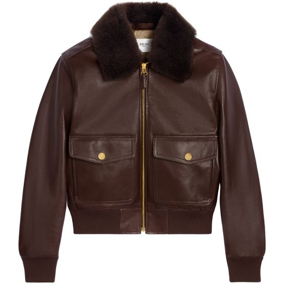 Unveil Celine's Aviator blouson jacket in calfskin. This classic fit jacket features a shirt collar with removable shearling, two patch pockets with flaps, ribbed trims, and a zip closure adorned with a Triomphe embossed tassel. It is elegantly finished with four Celine Paris-engraved horn buttons on the removable collar.