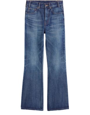 Introducing Celine's Bootcut Jeans in Dark Union Wash Denim. These jeans offer a classic fit with a mid-rise and flared leg. Designed with 5 pockets and detailed with front rivets, they showcase a Celine patch on the back waistband and feature a zip and jeans-engraved button.