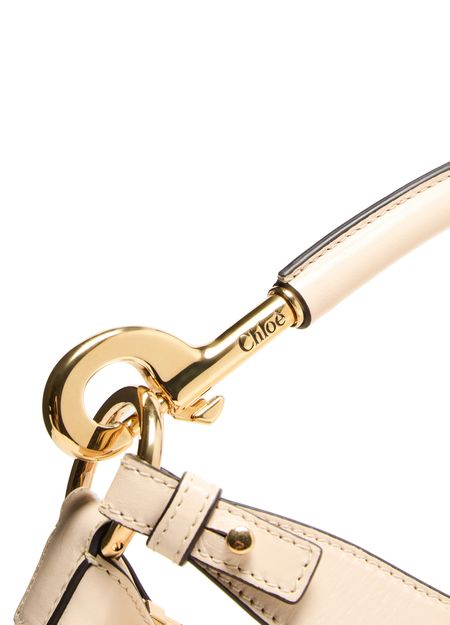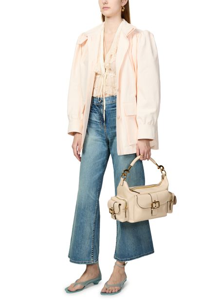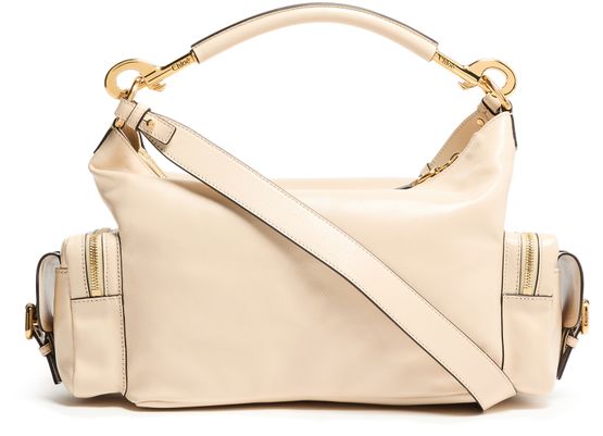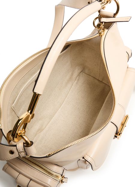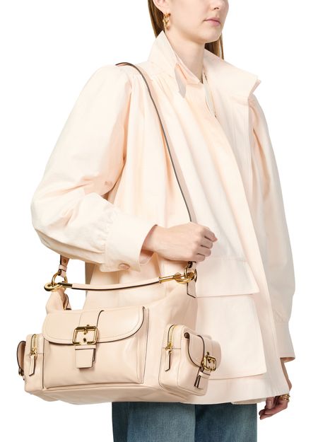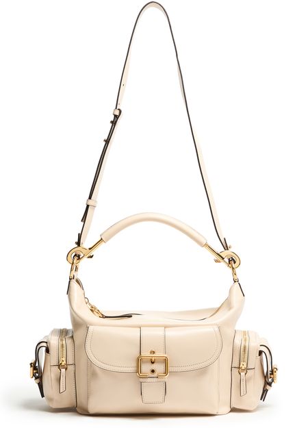Chloé's Camera bag showcases a sleek design with a zipper closure and a single compartment for essentials. Its gold finish adds a touch of elegance, complemented by double handles and visible topstitching. With interior patch pockets, it can be hand carried or worn crossbody using the detachable thin strap.
