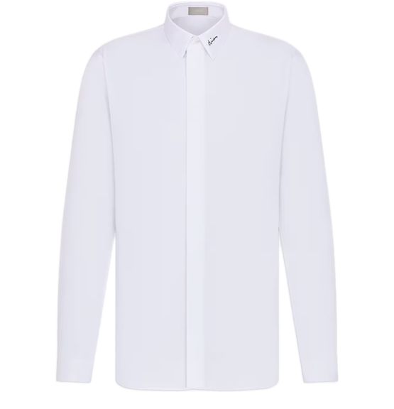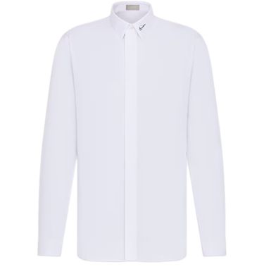 这款白色棉府绸衬衫的领口饰有对比鲜明的黑色小号“Dior”刺绣。隐形纽扣门襟、圆形底边和标志性 Dior 针脚设计让细节更丰满。