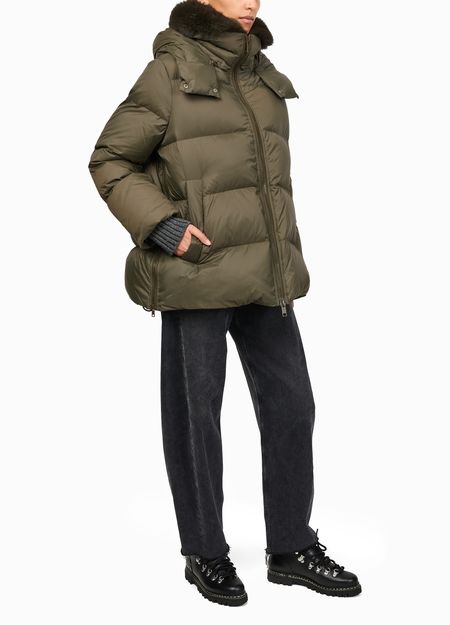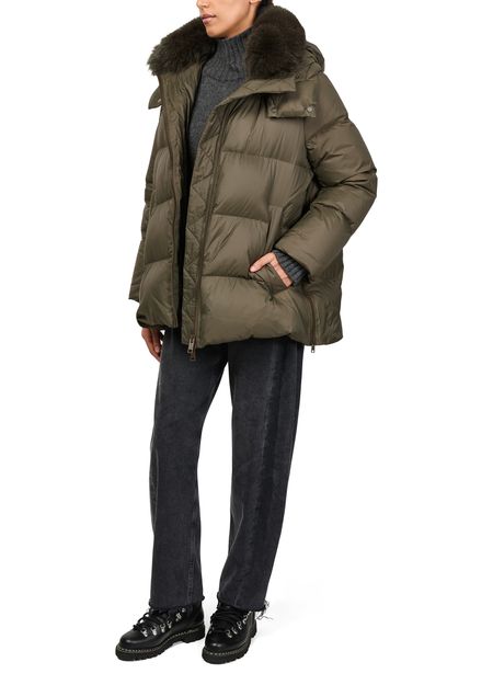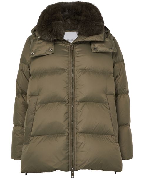 Unveil Yves Salomon's hooded puffer jacket with a mink fur collar, showcasing an oversized fit and short length for modern appeal. A padded texture and long sleeves add warmth, while side pockets and a zipper closure ensure practicality. This versatile piece transitions effortlessly from casual outings to formal settings.