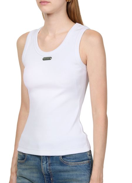 Reveal Alexander McQueen's Jersey tank top, a statement piece with its slim fit and round neckline. This sleeveless top features a crop length and front logo, combining style with a modern edge. Perfectly versatile, it pairs effortlessly with various outfits for a chic, contemporary look.