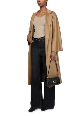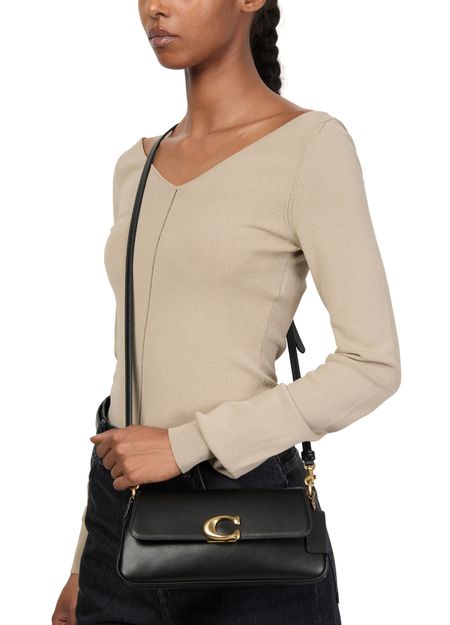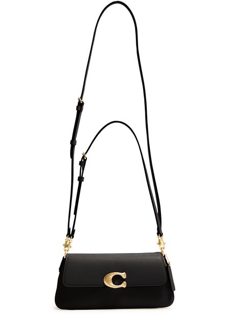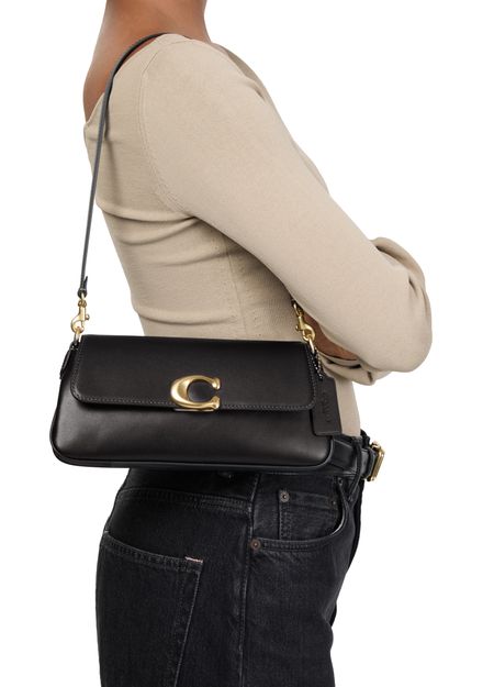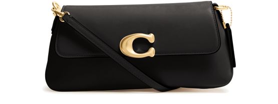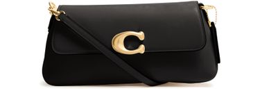 Reveal Coach's Jet shoulder bag, a fusion of elegance and functionality. Crafted from smooth leather, it showcases a distinctive magnetic "C" buckle and a front logo. The adjustable, detachable thin strap adds versatility, while the zippered interior pocket ensures practicality. Gold finishes and visible topstitching complete this chic accessory.
