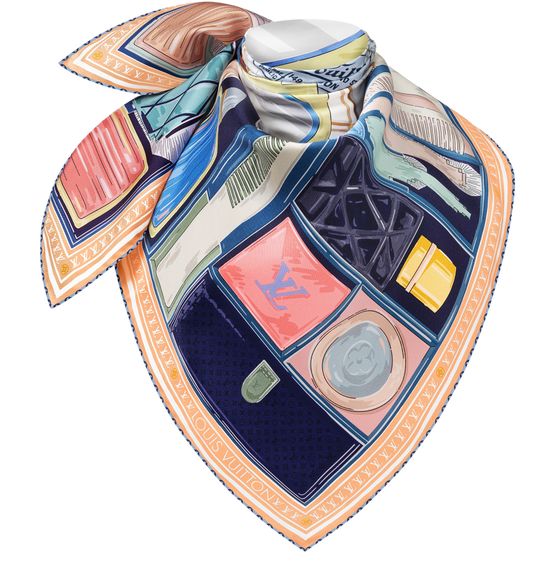 Malle Coiffeuse 桑蚕丝方巾致意品牌制箱传承,以梳妆箱图案融汇化妆品、镜子、香水瓶、梳子等元素,借由摩登格调和精湛匠艺展现柔美意韵。