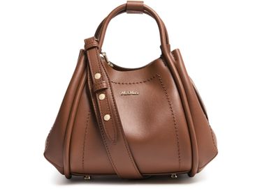 Reveal Max Mara's Marine handbag, a refined shoulder piece crafted in smooth leather. This elegant design features double handles and a wide, adjustable strap, providing versatility and comfort. The snap-button fastening secures your essentials within a single compartment, while gold-finished, visible topstitching and a front logo in gold letters enhance its luxurious allure.