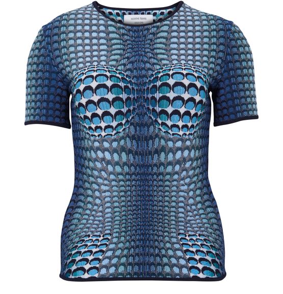 Moonfish 上衣采用短袖修身T恤的经典造型,搭配风格大胆的装饰图案。 其新颖、富有未来感的造型尽显 Marine Serre 的创意雄心。