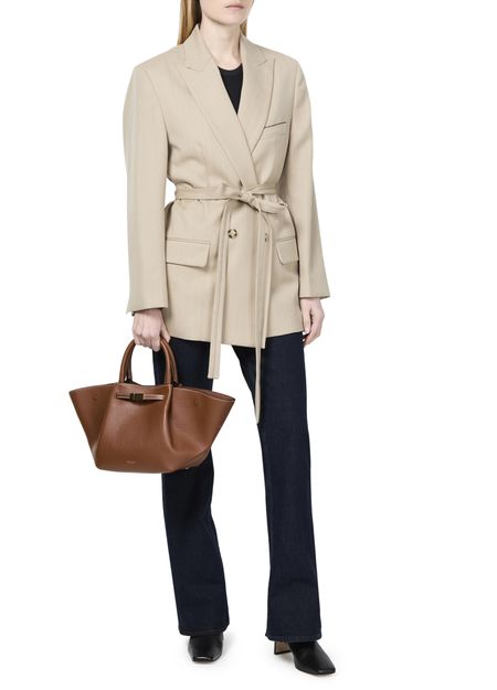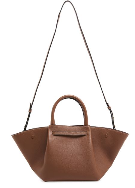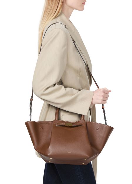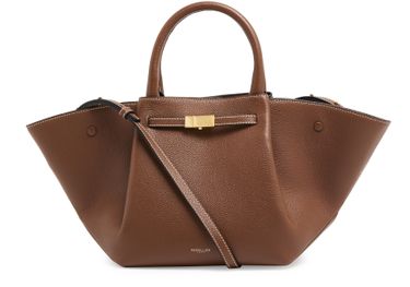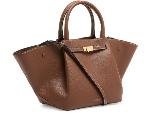 Reveal Demellier's The Midi New York handbag, crafted from grained leather with double handles and a thin, adjustable strap for versatile wear. The front logo, visible stitching, and silver finish add refined detail, while spacious compartments and secure snap-button fastening ensure both style and practicality.