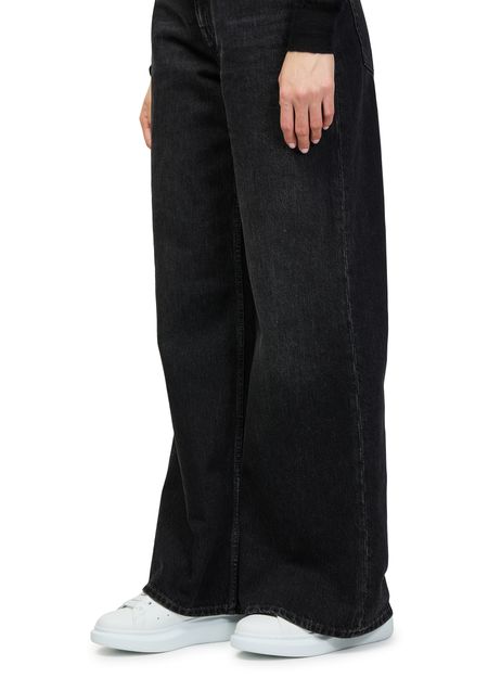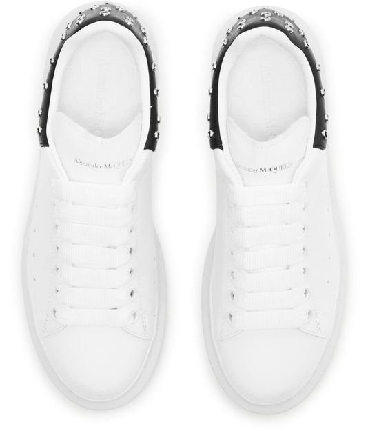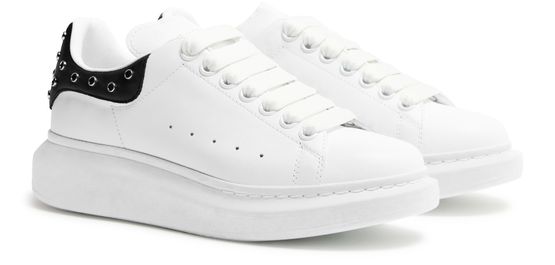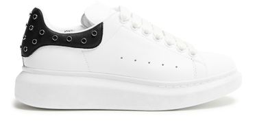Reveal Alexander McQueen's oversized sneakers, crafted from smooth leather with a low platform heel and round closed toe. Laces and a strap ensure a secure fit, while visible stitching and studded details add edge. The thick outer sole and engraved logo on the tongue complete this modern statement.