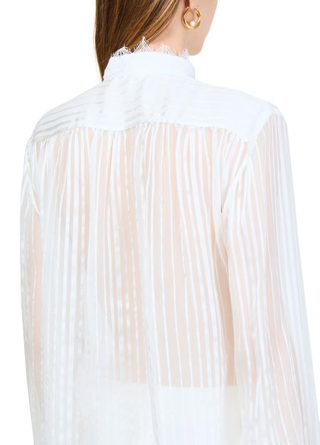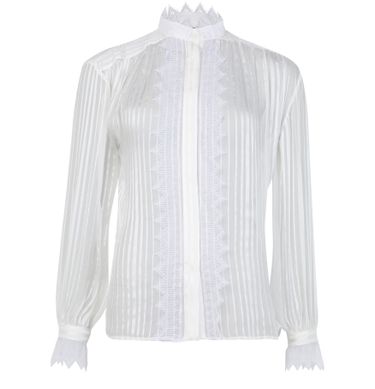 Reveal Chloe's silk blouse, a blend of elegance and charm. Its high-neck design and long-sleeved, cuffed sleeves offer a refined silhouette, while the striped print adds a modern touch. The button fastening ensures a sleek fit, making it a versatile piece for any occasion.