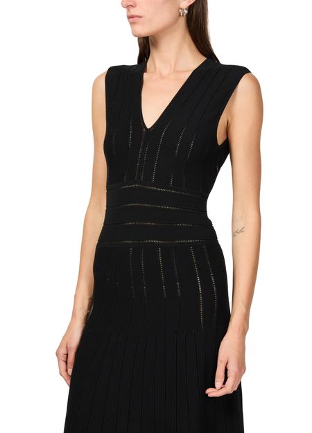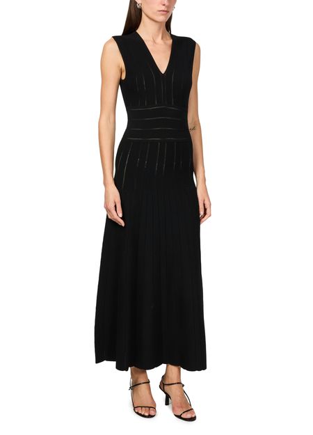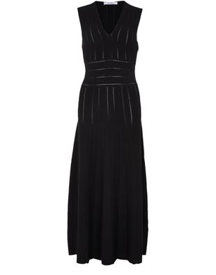 Unveil the allure of the Max Mara Tallone maxi dress, an epitome of elegance with its A-line cut and midi length. This sleeveless creation boasts a sophisticated V-neckline and is adorned with visible stitching, ensuring a sleek silhouette. The side zipper closure adds a touch of practicality to this stylish piece.
