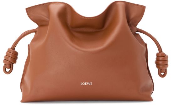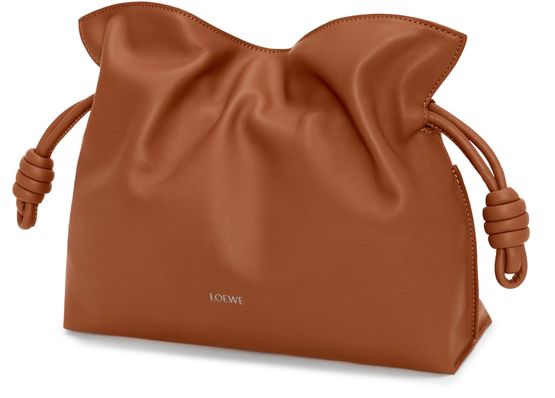Introducing Loewe's Flamenco medium clutch in nappa calfskin, a statement piece that embodies elegance with its smooth leather and impeccable craftsmanship. The clutch features a drawstring closure, visible topstitching, and a front logo, blending fashion with functionality effortlessly.