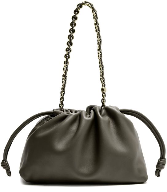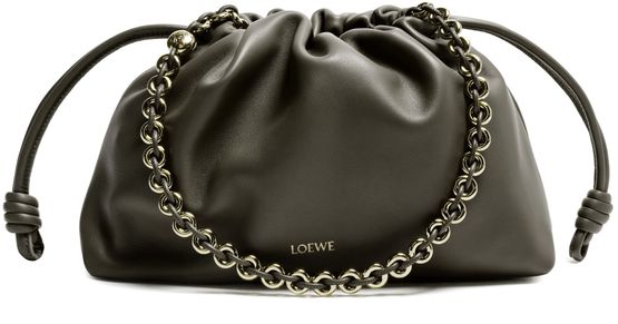 Introducing Loewe's Medium Flamenco bag in mellow nappa lambskin. This timeless shoulder bag is crafted from smooth leather, featuring a chain strap for versatile wear. The elegant drawstring closure, single compartment, and visible topstitching highlight Loewe's craftsmanship. Adorned with a front logo in gold letters and finished with gold accents, it's an exquisite choice for any occasion.