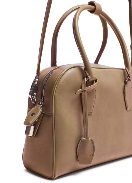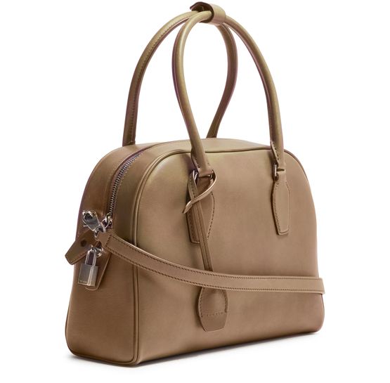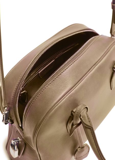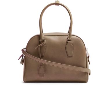 Reveal The Row's India 10.00 bag, crafted from grained leather with double handles and a thin, adjustable strap for versatile wear. The visible stitching and silver metal finish highlight refined craftsmanship, while the spacious single compartment and zipper closure ensure both style and practicality.