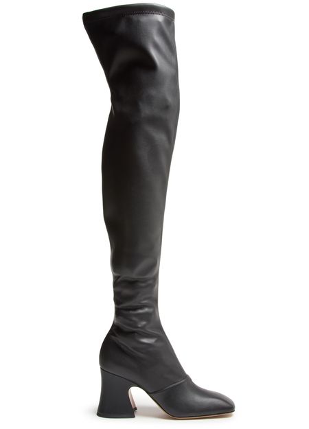 Embrace Chloe's Janis boots, crafted from smooth leather with a chic block heel. These high-heeled beauties feature a modern square toe, enhanced by visible stitching and a convenient side zipper, offering both style and functionality.