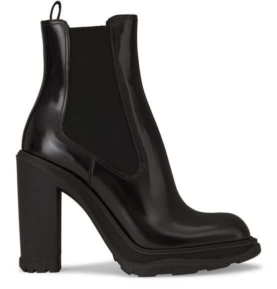 采用光面皮革制成的此款 Alexander McQueen 签名 Chelsea 风格短靴,选用原创圆形鞋跟设计搭配带槽平跟鞋底。