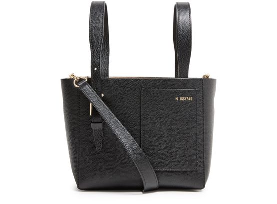 - 描述 : Small bucket bag, shoulder bag, crossbody bag, double handles, leather handle, carry handle, thin strap, adjustable, detachable strap, logo in gold letters, grained leather.