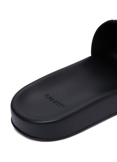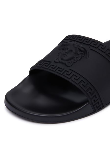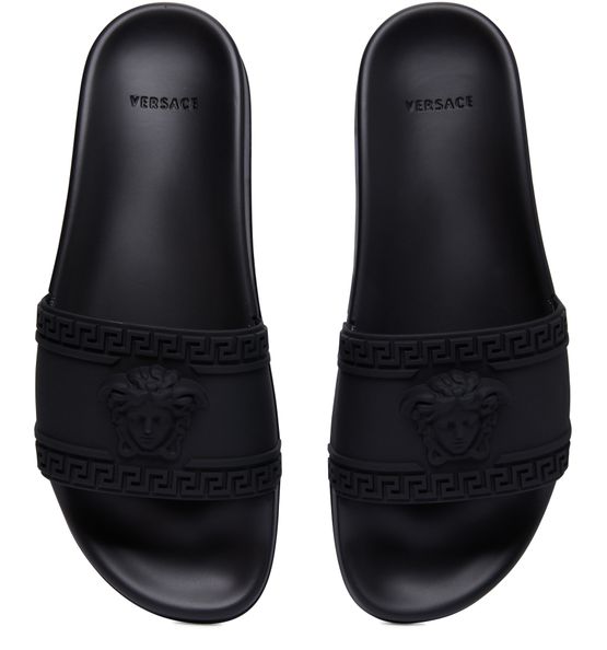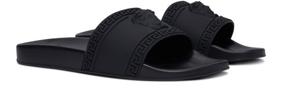 此款 Palazzo 凉鞋由 Versace 签名。 此款轻巧鞋型的最大特色就在于其镶有美杜莎头像和标志性 Greca 图案的宽大系带。