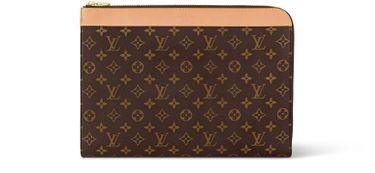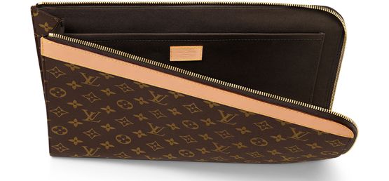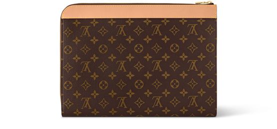 Pochette Jour 手拿包采用 Monogram 涂层帆布、做旧牛皮革饰边和金属件,彰显路易威登的经典材质与色彩。L 形拉链广口开启简洁内里,贴袋可收纳贵重物品。