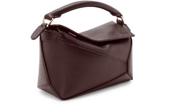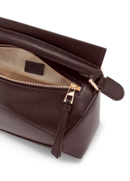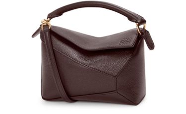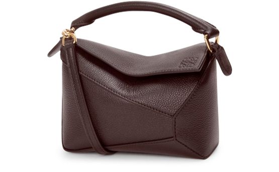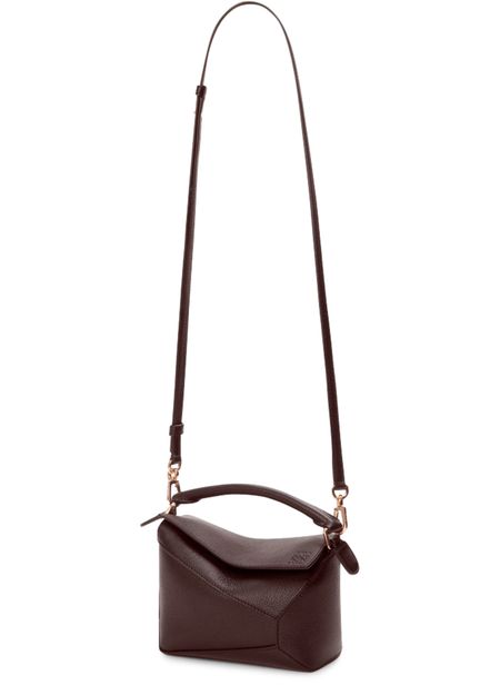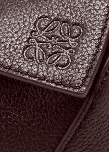 Introducing Loewe's Puzzle Edge mini bag, featuring a chic Anagram medallion. Crafted from grained leather, it boasts a single handle and a detachable strap for versatile carry. The zipper closure and visible topstitching enhance its elegant design, while the embossed logo and gold finish add a touch of sophistication.
