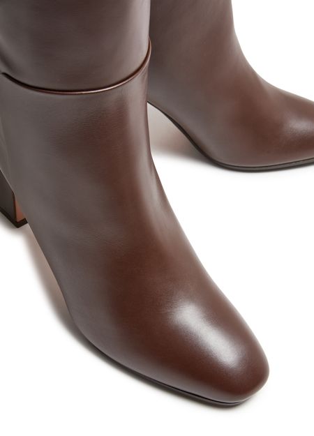 Unveil Aquazzura's Sellier 85 boots, crafted from smooth leather with a sophisticated square toe and closed design. These high block heels feature visible stitching and a leather outer sole, ensuring both style and durability. Perfect for elevating any ensemble with their chic and modern appeal.