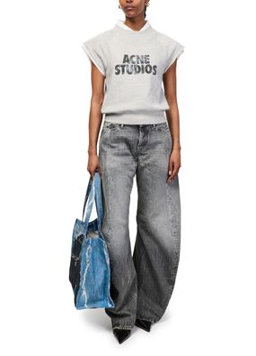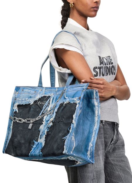 Reveal Acne Studios's tote bag, crafted from faded denim with double handles for effortless carrying. The front logo and patch detail add a signature touch, while visible contrast stitching and a silver finish elevate its modern appeal. A zippered interior pocket ensures your essentials stay secure.